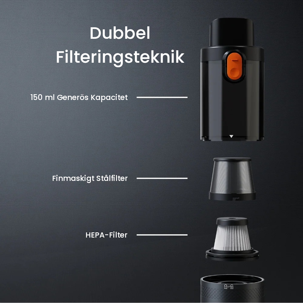 Behållare rymmer 150 ml – fullt tillräckligt för att samla upp damm och smuts för djup rengöring.